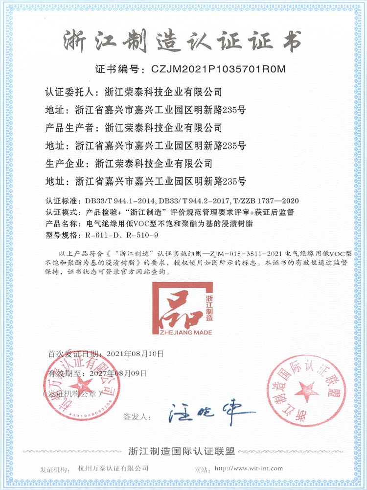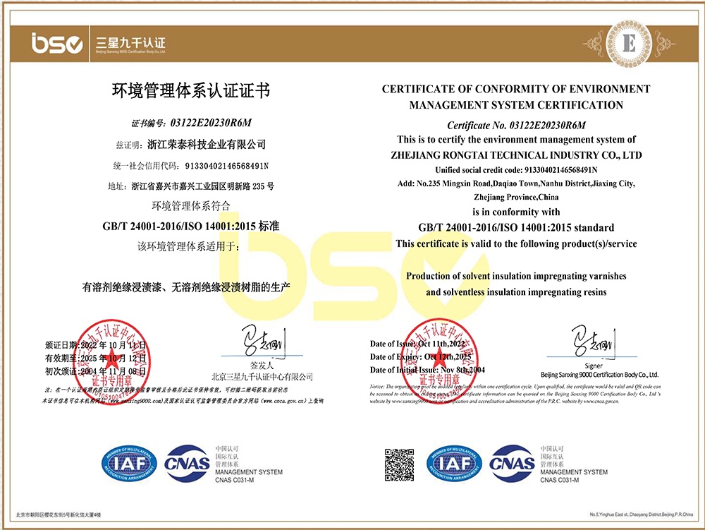• 浙江榮泰科技企業(yè)有限公司為專業(yè)生產(chǎn)高性能絕緣材料的國家高新技術(shù)企業(yè)、國家“小巨人”企業(yè),為國內(nèi)最大的絕緣漆生產(chǎn)商,全國絕緣材料行業(yè)協(xié)會的副理事長單位,規(guī)模、產(chǎn)品技術(shù)和創(chuàng)新能力處于同行業(yè)領(lǐng)先地位。